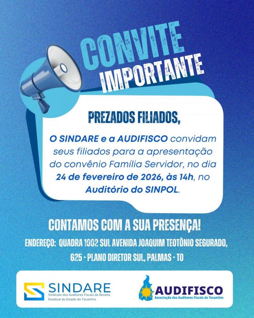 O SINDARE e a AUDIFISCO tem a satisfação de convidá-los(as) para a apresentação do convênio FAMÍLIA SERVIDOR, que será realizada no dia 24 de fevereiro de 2026 (24/02/2026), às 14h, no auditório do SINPOL.