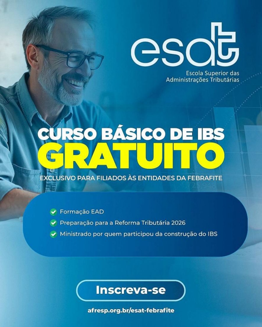 A FEBRAFITE, entidade da qual a AUDIFISCO é filiada, está oferecendo — em parceria com a ESAT — o Curso Básico sobre o Imposto sobre Bens e Serviços (IBS), totalmente gratuito e exclusivo para associados (as)!
