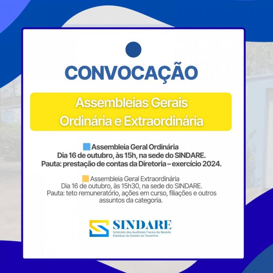 O Sindicato dos Auditores Fiscais da Receita Estadual do Estado do Tocantins (SINDARE) convoca todos os seus filiados para participarem das Assembleias Gerais Ordinária e Extraordinária, que serão realizadas no dia 16 de outubro de 2025 (quinta-feira), na sede social do sindicato, localizada na Quadra 103 Norte, Rua NO-11, Lote 34, Plano Diretor Norte, em Palmas/TO.